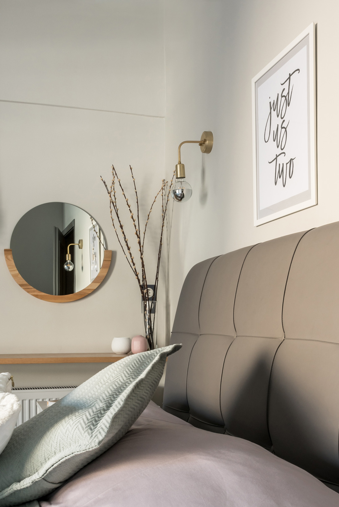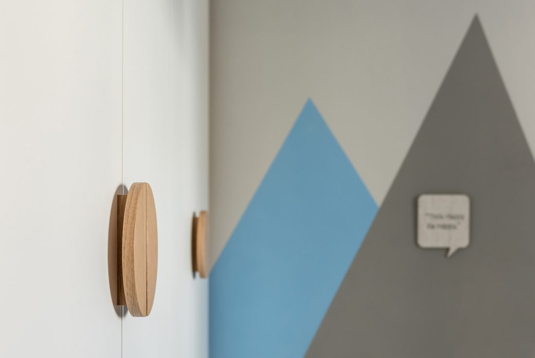 Entering the apartment you find the living and dining room area expanding around the fireplace, which was redesigned and coated with dark natural Kourasanit filler, contrasting the all natural and bright tones. Expanding the fireplace, a seating spot was created next to it, and lots of storage inside its hidden cupboards. An almost all white kitchen and a small WC complete the communal spaces. The primary material used throughout the flat was light oak with the addition of grey white and blue for added contrast. Lighting fixtures with brass finishes where chosen for a modern and fresh look to the apartment.