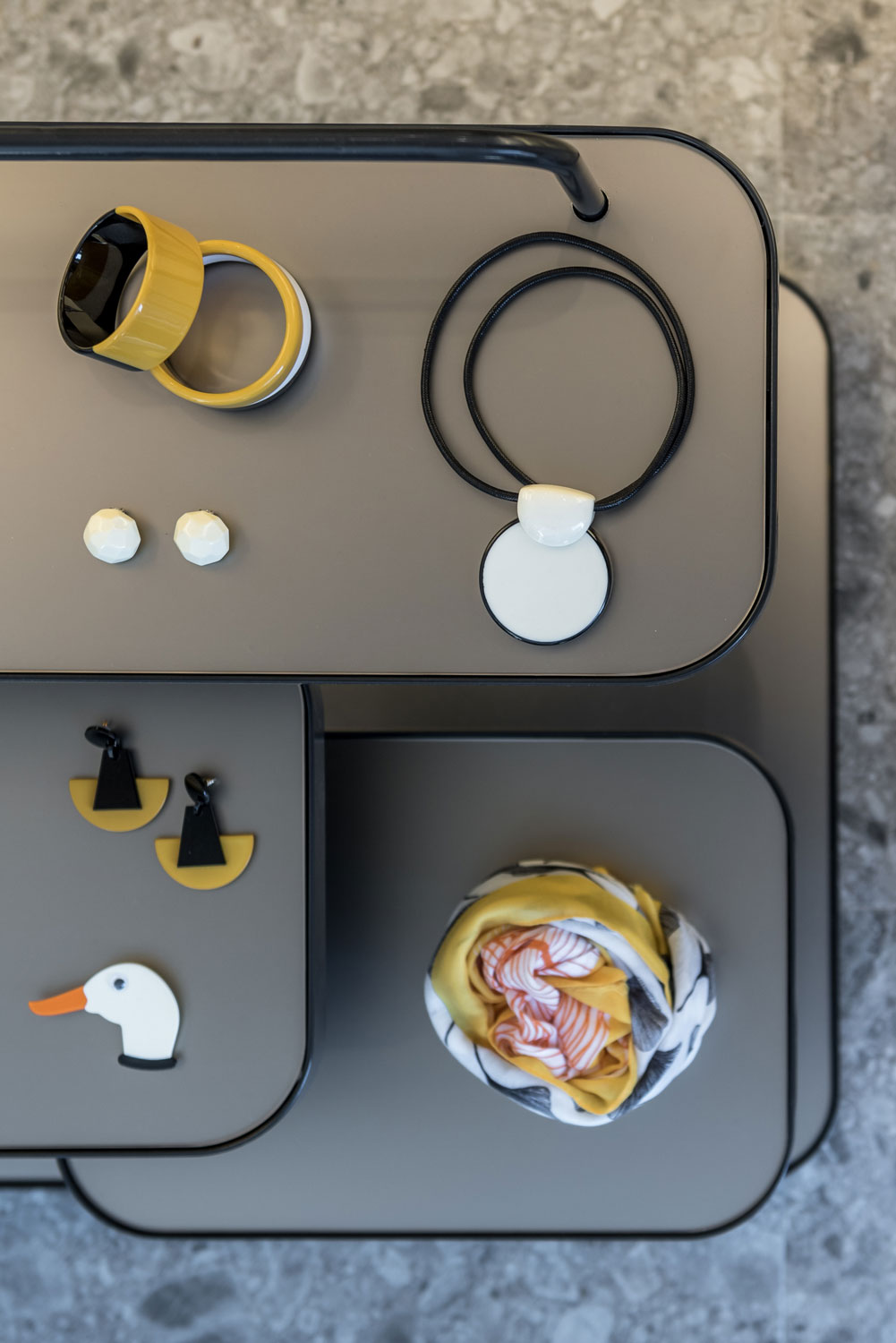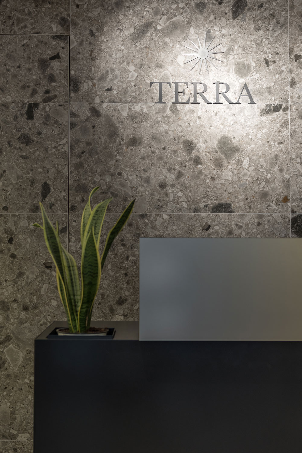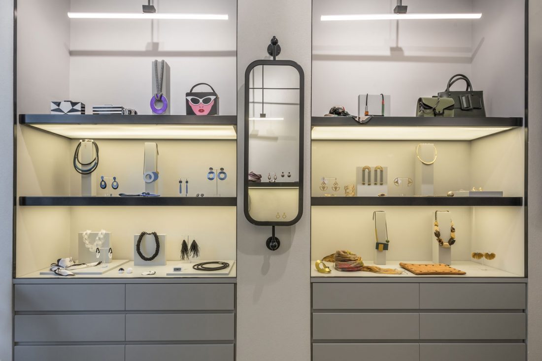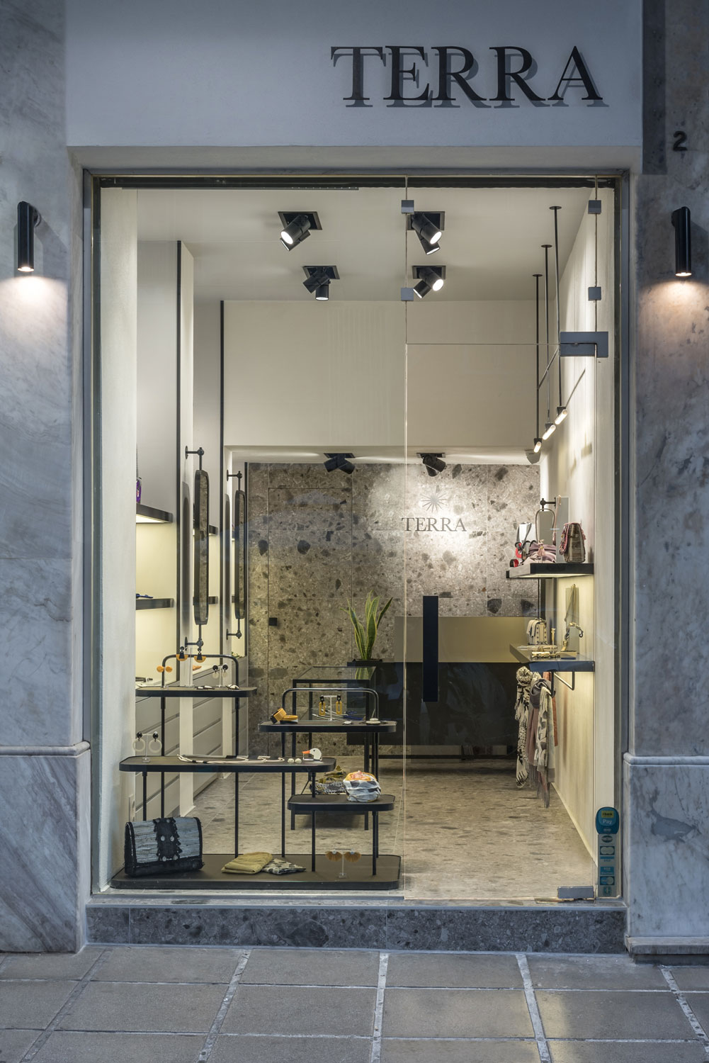 Located in the busiest area in the center of Thessaloniki, is the urban Terra. The studio was tasked with designing a new interior for this tiny 13m² jewelry store. Aiming to maximize space, the design team created built in display cases for the jewelry and accessories along with minimal graphite metal shelves. The surrounding walls were painted white and the only texture standing out, are the stone-like tiles that were used on the floor and at the back wall of the cashier desk, creating an interesting backdrop for the window display.