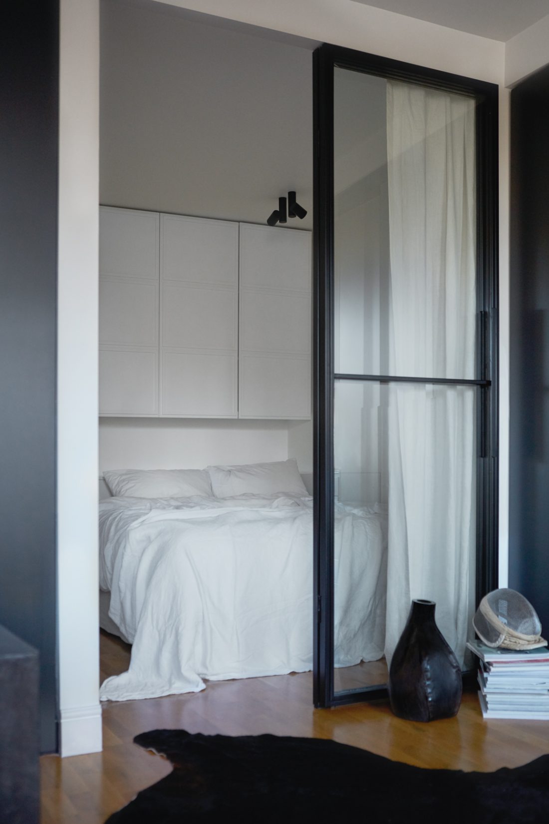 The renovation sought to make better use of space, maximize storage and update finishes creating an earthy and warm atmosphere. The transparent black framed partition separates the living room and the kitchen from the bedroom, while creating a feeling of a single space. The custom marble sink in the dark and moody bathroom is combined with metal fixtures evoking a sense of luxury.