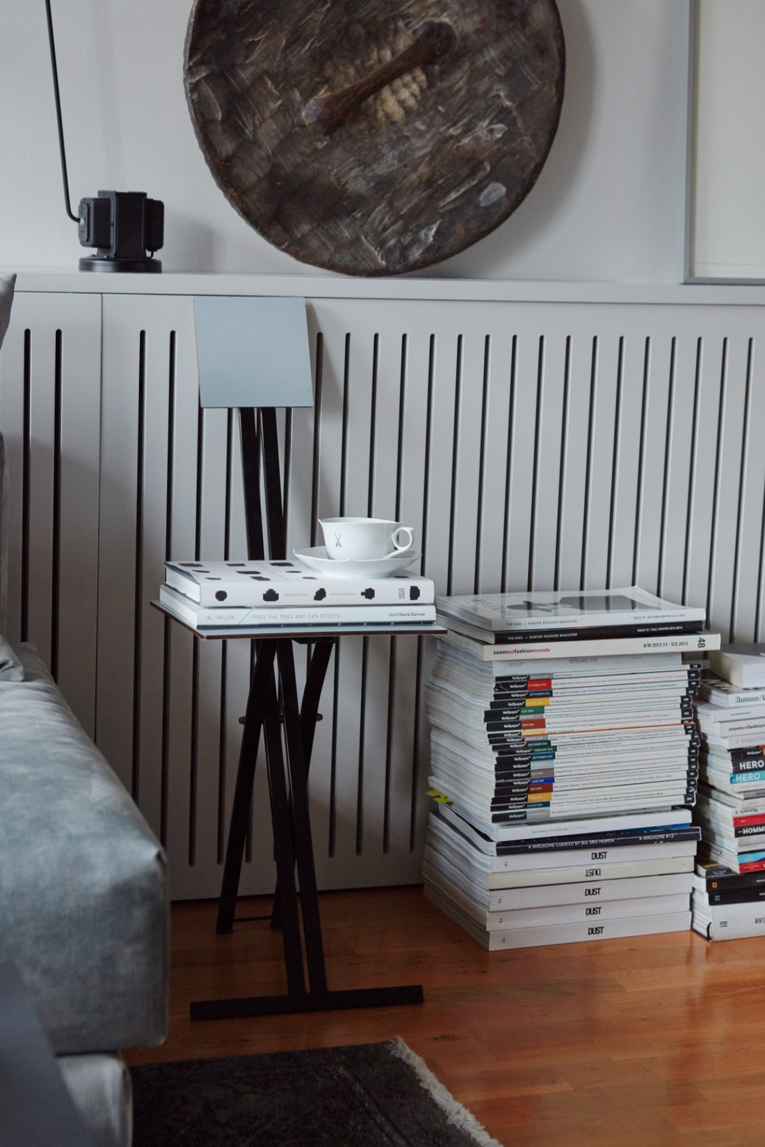 The contemporary, harsh feel of stainless steel used in the custom handmade cabinetry and counter, marble and lacquer, juxtaposes the warm and cozy sense of velvet and linen fabrics used throughout the apartment. A color scheme of subtle tones on the walls and ceilings amplify the natural light coming from the street facing windows. The prominent dining table made of travertine serves as a centerpiece with its monolithic form complemented by the elegant silhouette of a three-legged chair. The armchair and coffee table in the living room follow the same archetypal volumes. These graphical interpretations of ancient, almost brutal, volumes bring unexpected character and comfort to the contemporary living space.